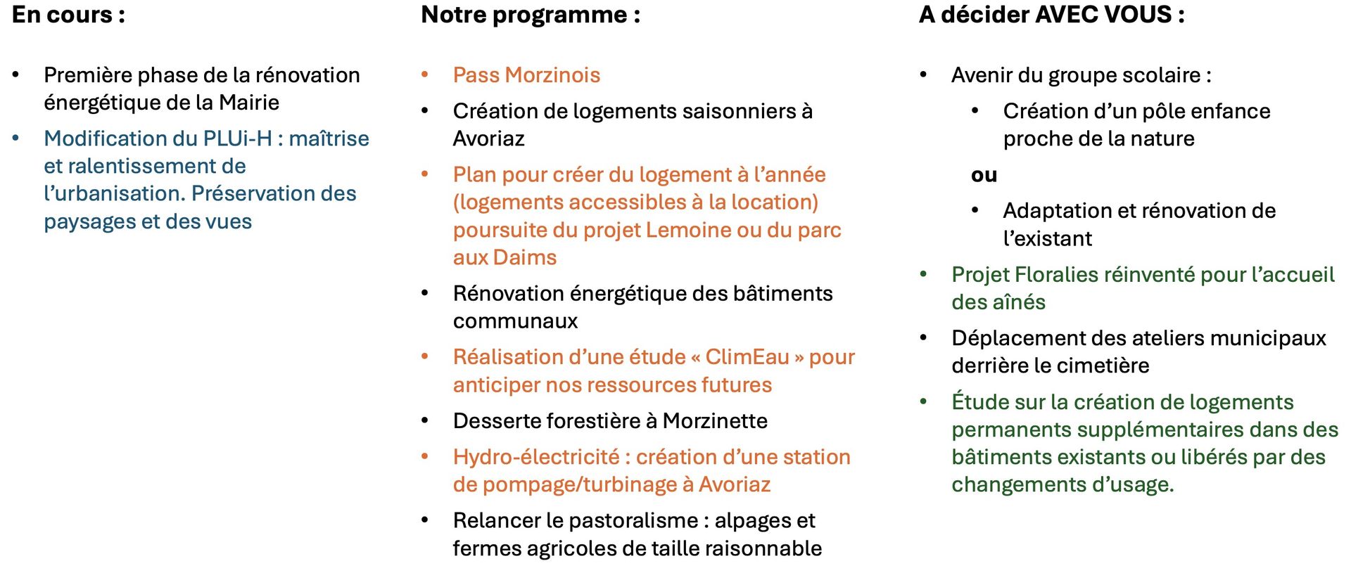 Nous voulons replacer les habitants, le cadre de vie et l’environnement au cœur des décisions, en veillant à ce que les retombées du tourisme bénéficient directement à la vie locale. Bien habiter Morzine Avoriaz, c’est pouvoir s’y loger et s’y soigner, fonder une famille, s’épanouir et vieillir dignement dans un village préservé, harmonieux et fidèle à son identité alpine.