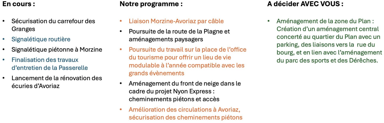 Si la qualité du ski sur le secteur Morzine–Les Gets reste globalement satisfaisante, l’attractivité exceptionnelle d’Avoriaz génère aujourd’hui un déséquilibre territorial marqué : concentration des flux, saturation des accès routiers et des remontées mécaniques, pistes surchargées et congestions majeures en période de pointe. Parallèlement, l’augmentation des capacités d’hébergement a fait entrer Morzine dans une nouvelle échelle de fréquentation, sans que le village ne s'adapte à cette réalité. Il en résulte une saturation des navettes et des routes, des tensions dans l’espace public et des difficultés d’accès aux remontées mécaniques aux moments clés de la saison. C’est ce décalage structurel que nous devons désormais corriger. Nous avons déjà entamé ce chemin avec un PLUIH bien encadré dont les modifications doivent être entérinées à la CCHC.